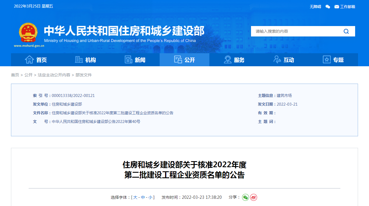 2022年3月21日,經住房和城鄉建設部審核批準,山東經典建設工程有限公司榮升建筑工程施工總承包壹級資質。