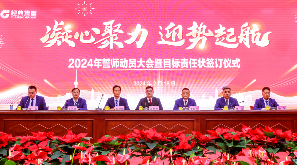 團(tuán)結(jié)凝聚力量,奮斗鑄就偉業(yè)。2月18日上午,經(jīng)典集團(tuán)2024年誓師動(dòng)員大會(huì)暨目標(biāo)責(zé)任狀簽訂儀式在職工會(huì)議中心成功召開,動(dòng)員集團(tuán)各部門錨定2024年各項(xiàng)目標(biāo)任務(wù),統(tǒng)一思想、凝心聚力,全力以赴抓好落實(shí),確保集團(tuán)高質(zhì)量發(fā)展再上新臺(tái)階。集團(tuán)董事會(huì)、集團(tuán)公司分管負(fù)責(zé)人、各單位負(fù)責(zé)人、工程項(xiàng)目經(jīng)理、各單位職工代表參加了會(huì)議。